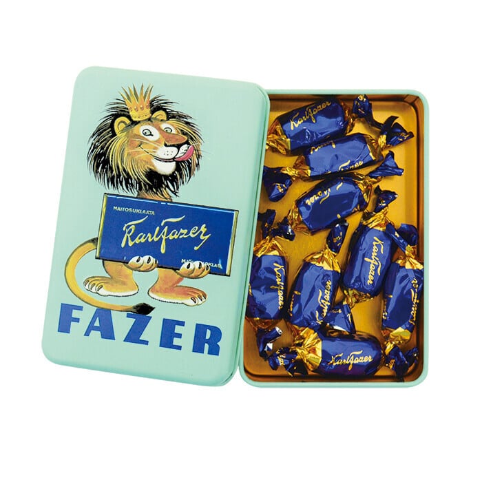 この缶のイラストはフィンランドで有名な挿絵画家、アレクサンダー・リンドベリが1950年代に展開されたFazerの広告用ポスターの為に描かれ、フィンランドの国章に使用されているライオンがモチーフになっています。